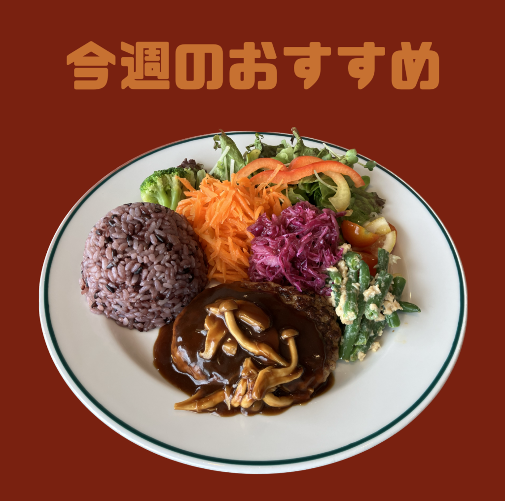 エリンギ、えのき、椎茸の三種のキノコを使用したデミグラスハンバーグです。 香りも食感もお楽しみいただけるプレートとなっております。 小さなお子様から大人までお楽しみいただける人気のメニューです。 ご来店を心よりお待ちしております!