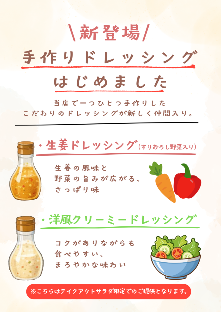 当店オリジナルのドレッシングをテイクアウトサラダでお楽しみいただけます!